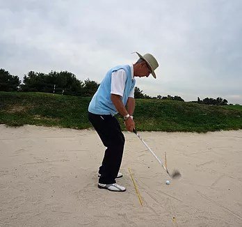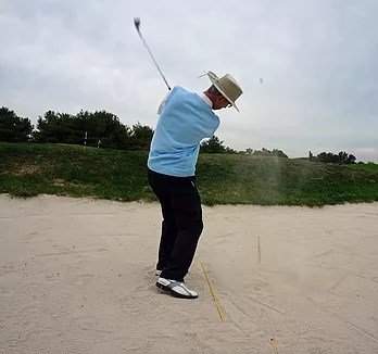 Notice that the bottom of the club head has struck the sand carrying it out towards the target.