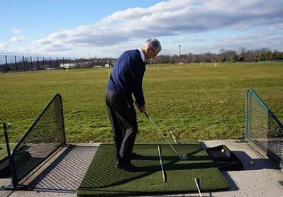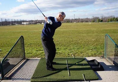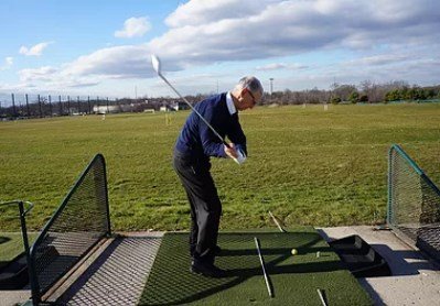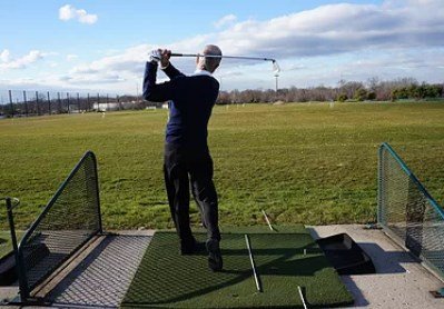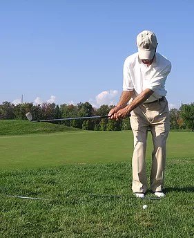 The tailbone is up and out, the shoulders are over the toes, and the weight is on the balls of the feet. This is the braced position needed, to create your athletic golf swing. The aim of the body is always on the inside of the target line. The upper body starts the golf swing.
