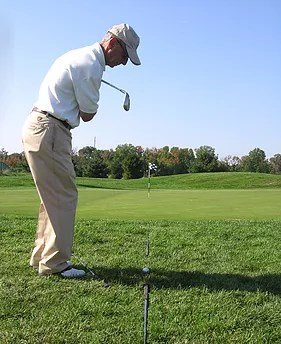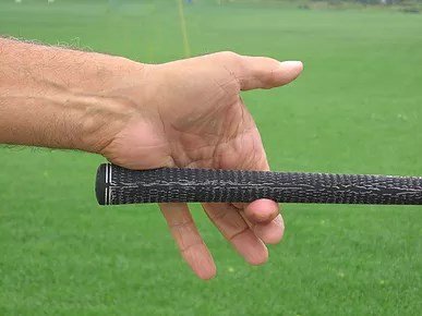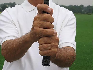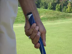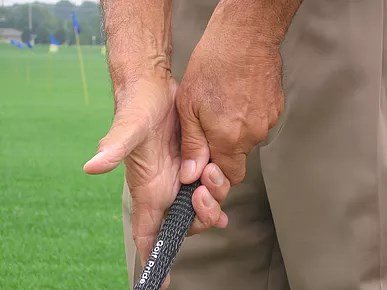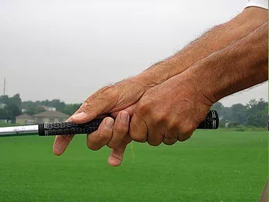 This demonstrates the overlap grip. Note the gap between the index and middle fingers of the right hand. This will allow the right elbow to hinge during the back swing.