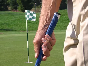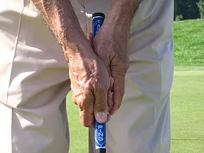 The grip of the putter is held in the palm of the right hand. The thumb is on top of the shaft.